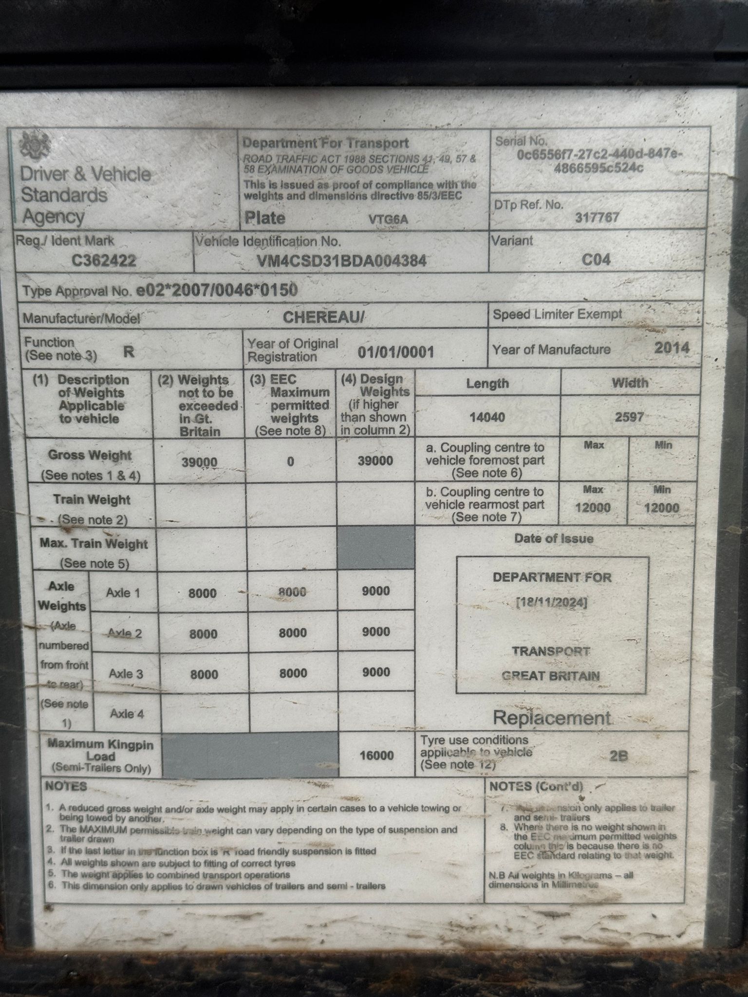 2014 Chereau, Thermo King SLXe300, 7754/4978hrs, Mono temp, Barn doors, 2.47 internal width, 2.6 internal height, BPW/DRUM, 12m MOT, Full fridge service